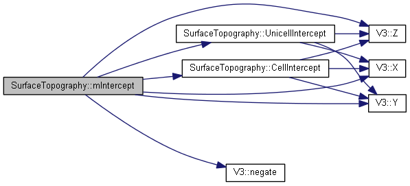 A function used by mIntercept. Returns true if the wp will intercept the surface of the cell betweeen two of the surface grid points.Returns true if the wp will intercept the surface of the cell. x1 and y1 should refer to the lower left grid point of the cell. t_c1 and t_c2 (where t_c1<=t_c2) should be the the parametric distance to the cell borders (or to points within the cell). The distance to the surface will be stored in t. The surface point will be stored in wp.mSposition, and the normal (always with positive z-comp.) will be stored in wp.mSnormal.